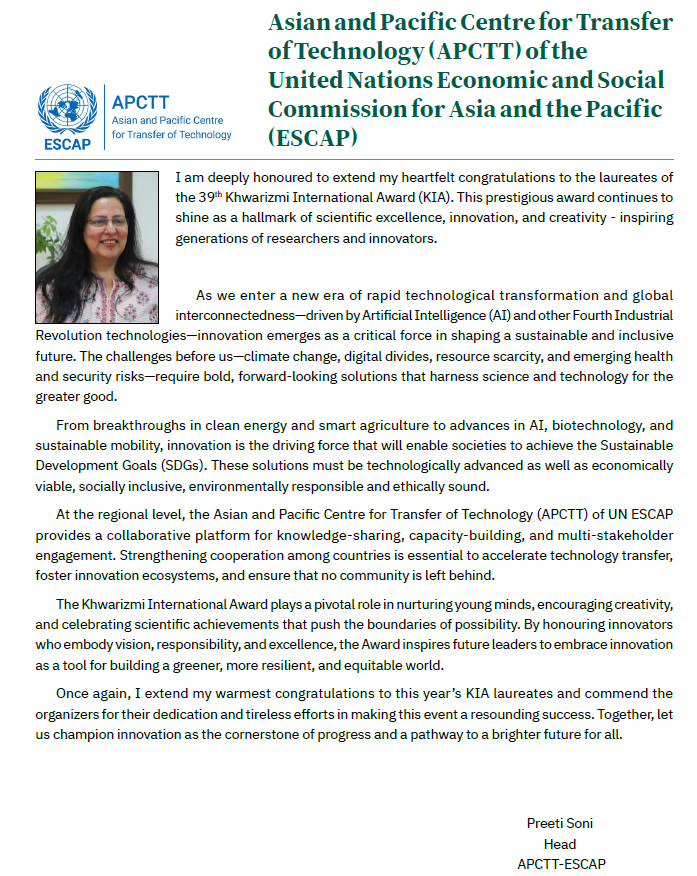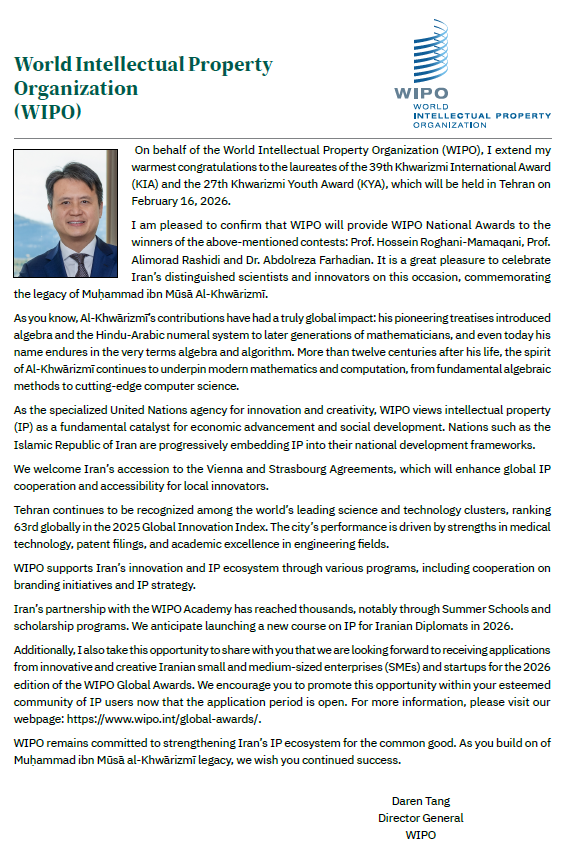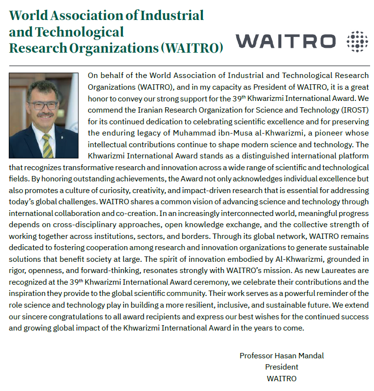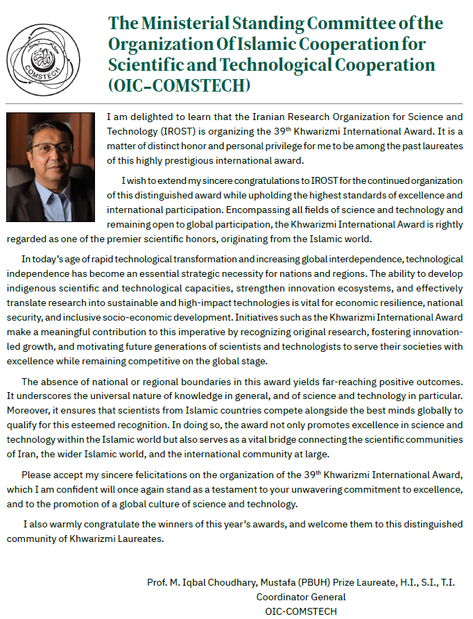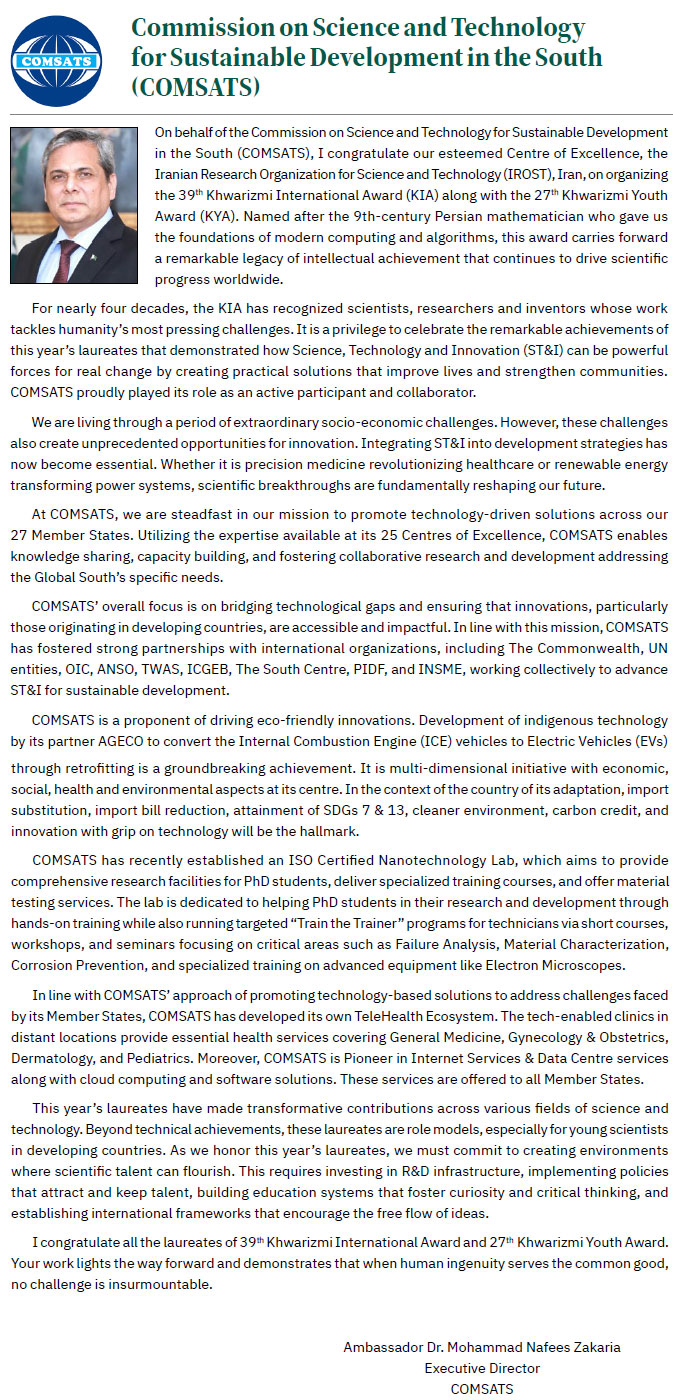 Messages from International Organisations on the Occasion of Khwarizmi Awards newsGroup : newsCode : 797 Copy keyWords