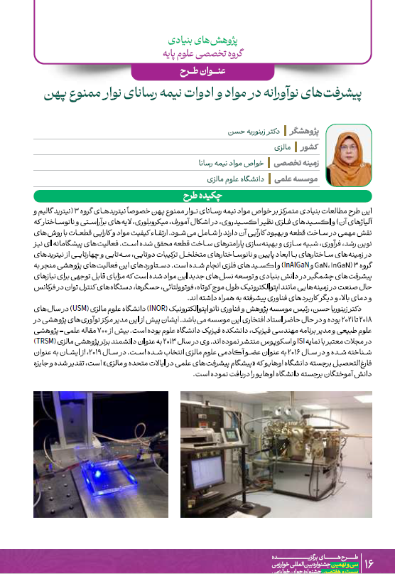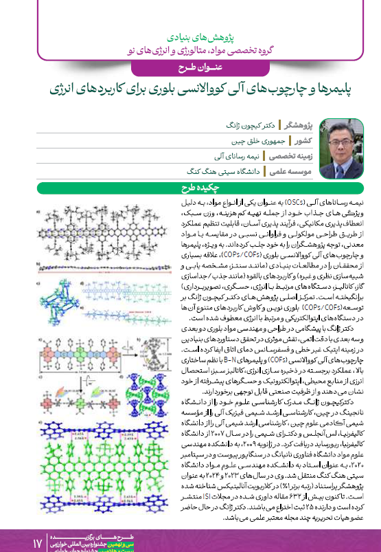 برگزیده از کشور جمهوری خلق چین آقای دکتر کیچون ژانگ با عنوان طرح " پلیمرها و چارچوبهای آلی کووالانسی بلوری برای کاربردهای انرژی" ، و برگزیده از کشور مالزی خانم دکتر زینوریه حسن با عنوان طرح " پیشرفتهای نوآورانه در مواد و ادوات نیمه رسانای نوار ممنوع پهن".