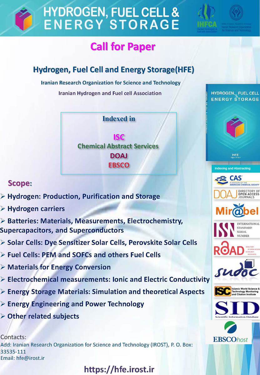 نشریه «هیدروژن، پیل سوختی و ذخیره‌سازی انرژی» (HFE)از اساتید، پژوهشگران و متخصصان گرامی دعوت به عمل می‌آید تا مقالات ارزشمند خود را در زمینه‌های مرتبط با هیدروژن، پیل سوختی و ذخیره‌سازی انرژی، جهت انتشار در مجله‌ی علمی «هیدروژن، پیل سوختی و ذخیره‌سازی انرژی» (HFE) ارسال نمایند. این نشریه علمی، که توسط سازمان پژوهش‌های علمی و صنعتی ایران و انجمن هیدروژن و پیل سوختی ایران منتشر می‌شود، با هدف توسعه و انتشار دانش در حوزه‌های پیشرفته‌ی انرژی، از مقالات پژوهشی و علمی شما استقبال می‌کند.زمینه‌های مورد پذیرش مقاله:مقالات در زمینه‌های زیر، در اولویت بررسی قرار خواهند گرفت:هیدروژن: تولید، خالص‌سازی و ذخیره‌سازیحامل‌های هیدروژنباتری‌ها: مواد، اندازه‌گیری‌ها، الکتروشیمی، ابرخازن‌ها و ابررساناهاسلول‌های خورشیدی: سلول‌های خورشیدی حساس به رنگ و سلول‌های خورشیدی پروسکایتیپیل‌های سوختی: پیل‌های غشای تبادل پروتون (PEM) و پیل‌های اکسید جامد (SOFC) و سایر انواع پیل‌های سوختیمواد برای تبدیل انرژیاندازه‌گیری‌های الکتروشیمیایی: رسانایی یونی و الکتریکیمواد ذخیره‌سازی انرژی: شبیه‌سازی و جنبه‌های نظریمهندسی انرژی و فناوری توانسایر موضوعات مرتبطنمایه‌سازی و چکیده سازی:مقالات منتشر شده در این مجله، در پایگاه‌های معتبر زیر نمایه‌سازی می‌شوند:ISCChemical Abstract ServicesDOAJEBSCOتماس با ما:برای کسب اطلاعات بیشتر و ارسال مقالات، می‌توانید از طریق آدرس زیر با ما در ارتباط باشید:آدرس: سازمان پژوهش‌های علمی و صنعتی ایران، صندوق پستی: 111-33535پست الکترونیکی: hfe@irost.irوب‌سایت: https://hfe.irost.ir